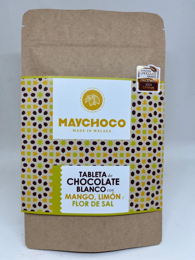 Un chocolate blanco artesanal elaborado con manteca de cacao de alta calidad, combinado con mango de la axarquía para aportar un dulzor tropical y con un toque de limón que aporta frescura y ligereza. La flor de sal realza todos los matices y equilibra la dulzura del chocolate, creando una tableta cremosa, vibrante y llena de contraste.