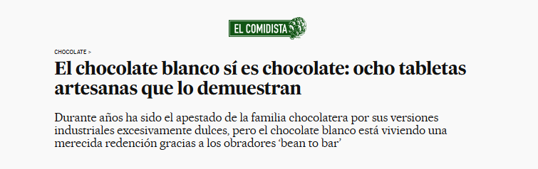 Recientemente Maychoco ha aparecido en El Comidista de El País como ejemplo de chocolates blancos de calidad. Nuestra tableta de chocolate blanco con lavanda y limón sin azúcar ha sido seleccionada entre las mejores de España, destacando por su originalidad, equilibrio de sabores y elaboración artesanal bean to bar.
