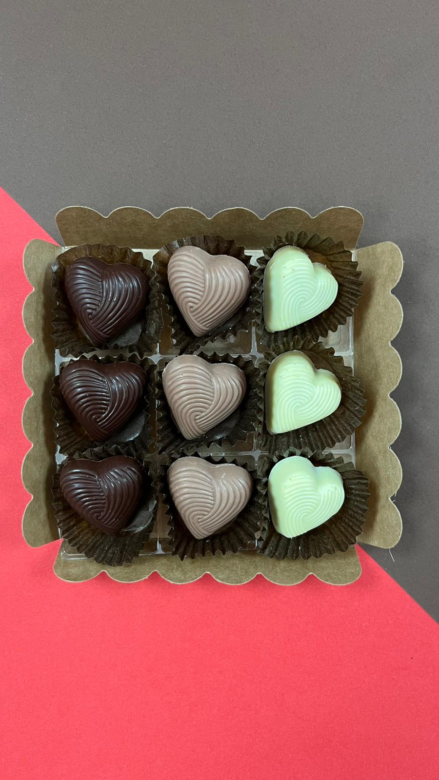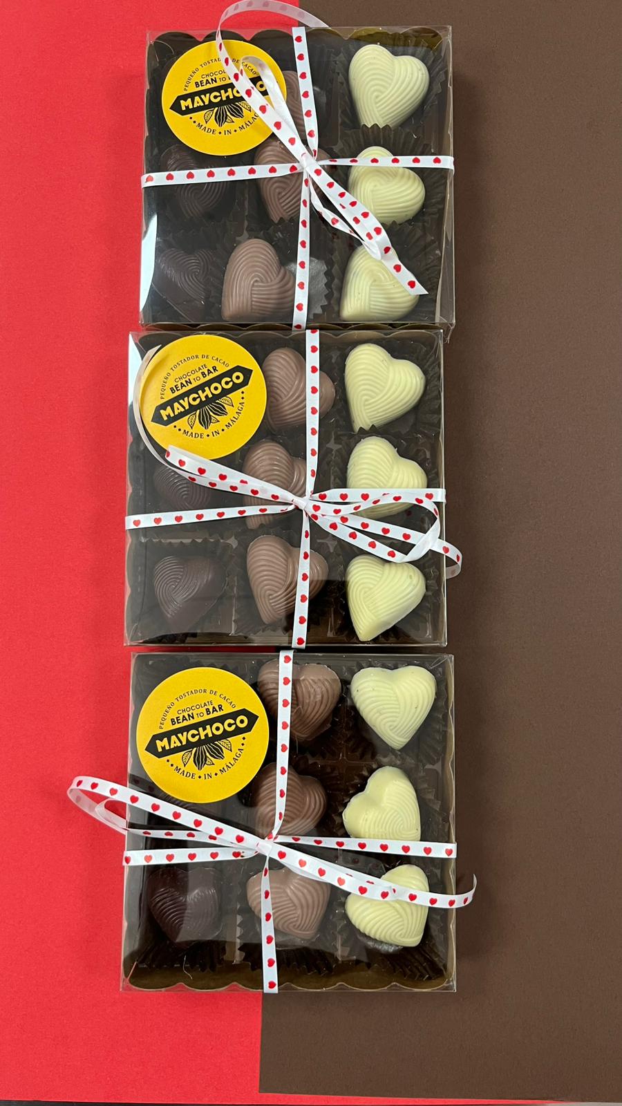 Este estuche reúne 9 bombones con forma de corazón, elaborados a mano en nuestro obrador de Málaga, combinando tres tipos de chocolate con rellenos frutales llenos de matices: