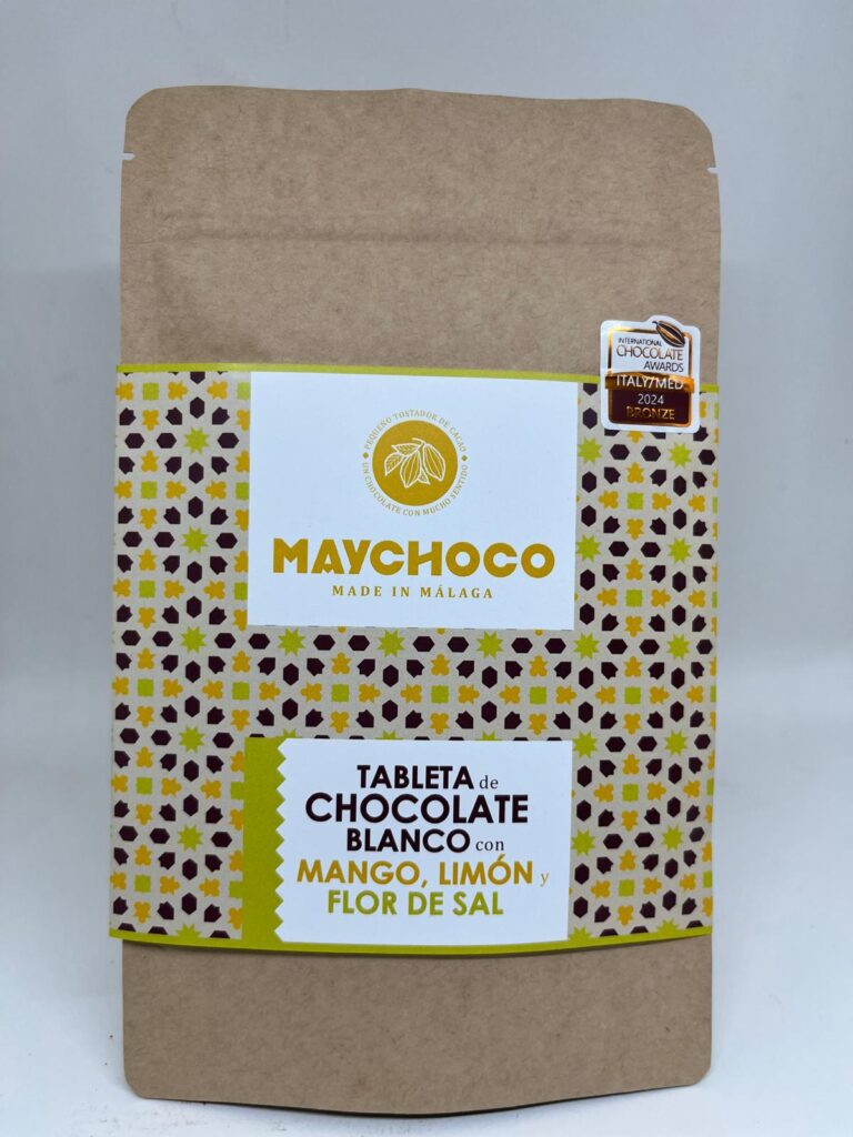 Esta tableta de chocolate blanco, con un mínimo de 36% de manteca de cacao, con mango y una toque de flor de sal, es nuestra “niña bonita”.