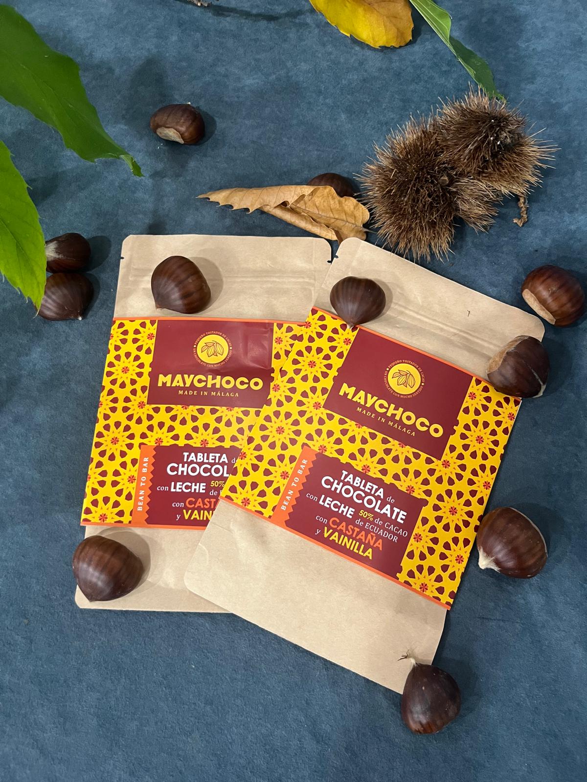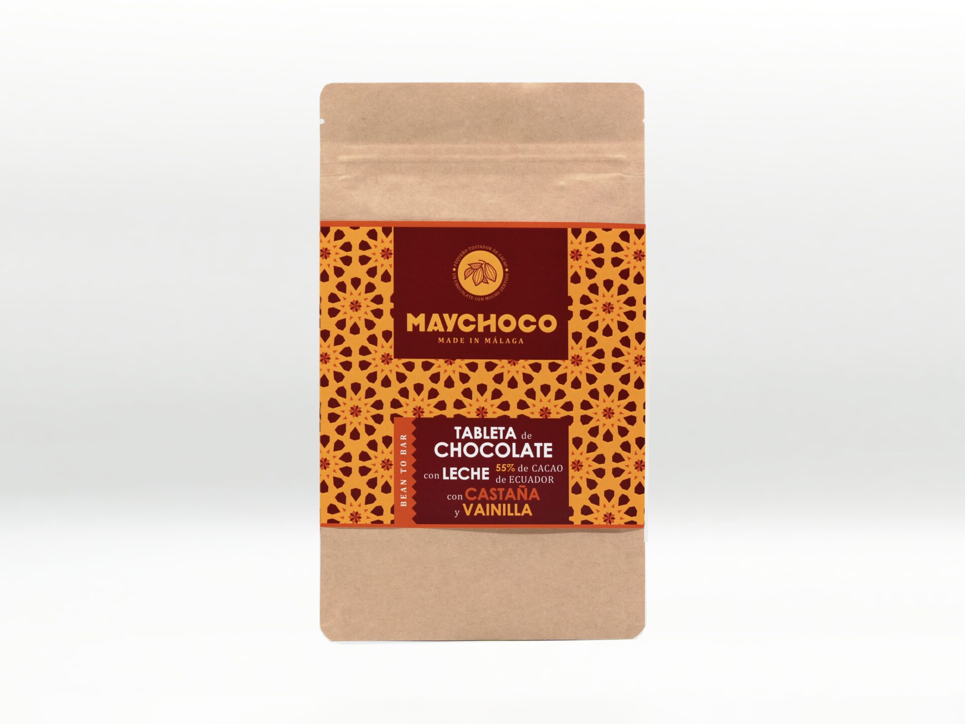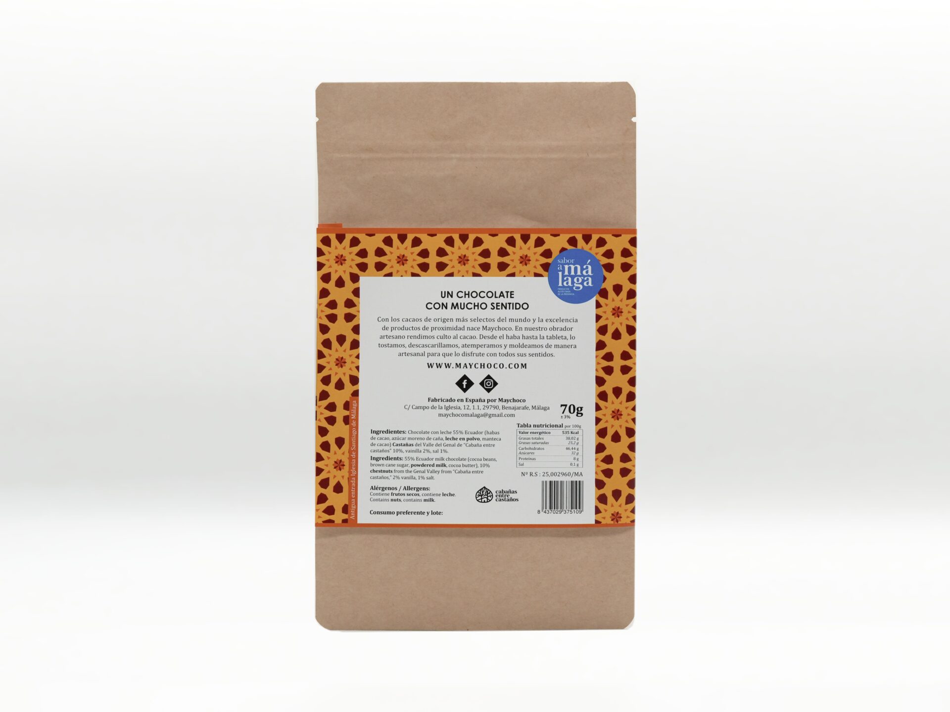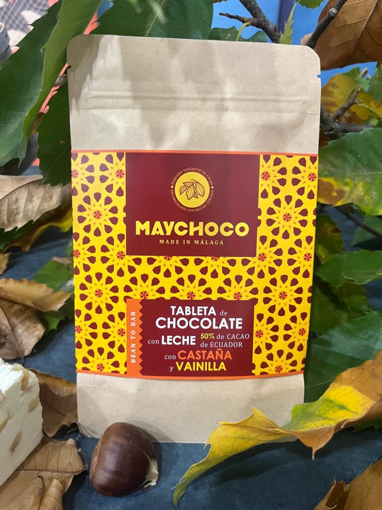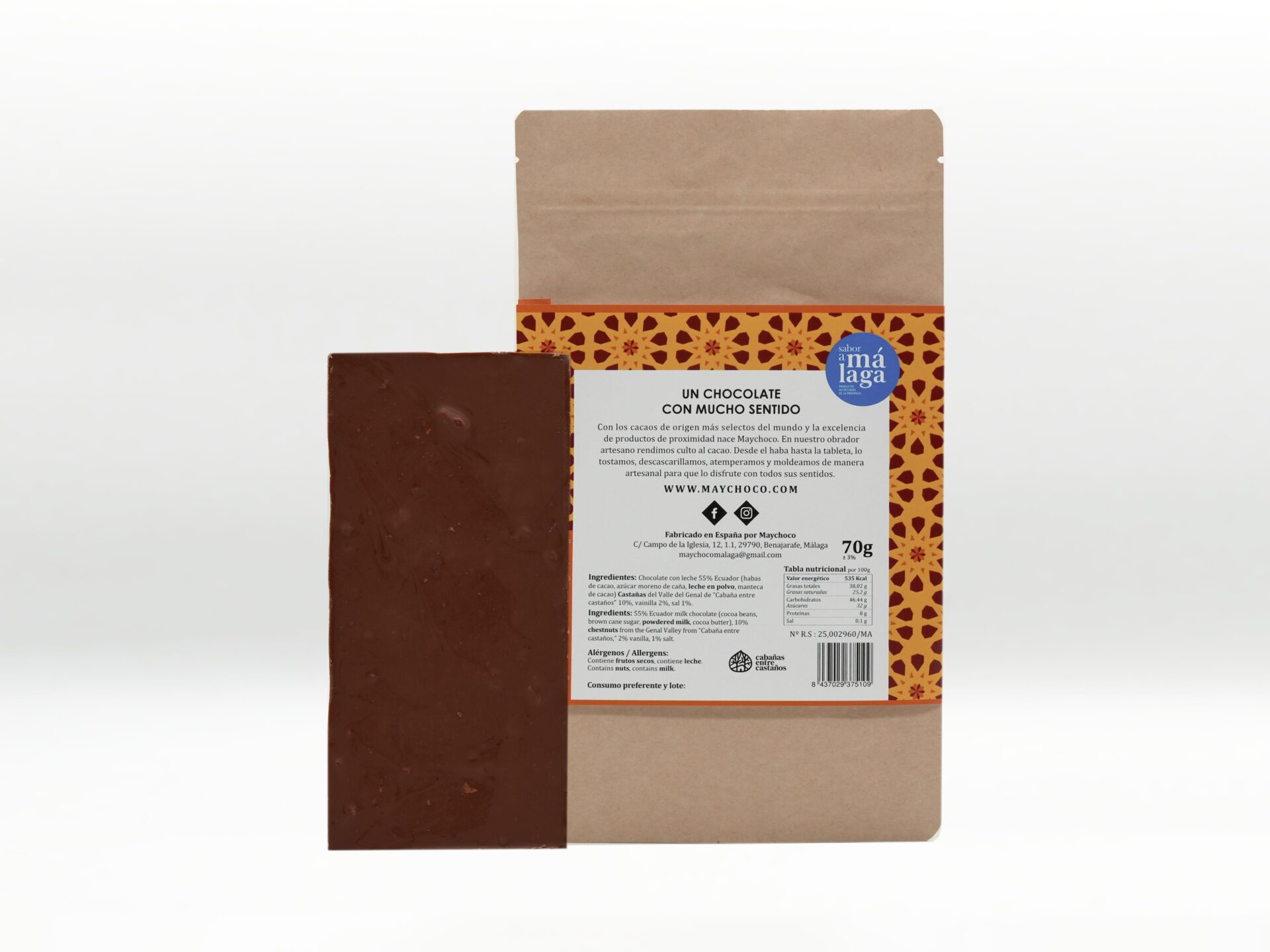 Esta tableta artesanal combina el mejor cacao de Manabí (Ecuador) con la auténtica castaña del Valle del Genal, con colaboración de «Cabaña entre Castaños» un fruto emblemático de Málaga. Su sabor suave y tostado se funde con la cremosidad del chocolate con leche 50% cacao, dando lugar a una experiencia única que celebra los sabores de nuestra tierra.